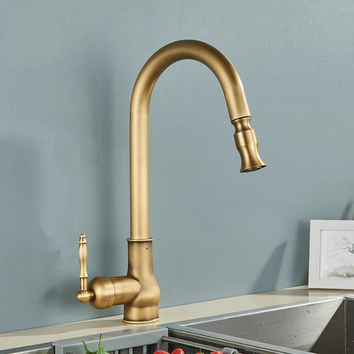 TimelessFlow - Antique Brass køkkenarmatur kombinerer klassisk elegance med moderne bekvemmelighed. Med en fantastisk antik messingfinish og en stilfuld sort accent tilføjer dette køkkenarmatur et strejf af vintagecharme til enhver køkkenindretning. Den drejelige tud sikrer fleksibilitet, hvilket gør det nemt at rengøre hvert hjørne af vasken, mens du ubesværet styrer varmt og koldt vand til alle dine madlavningsbehov.