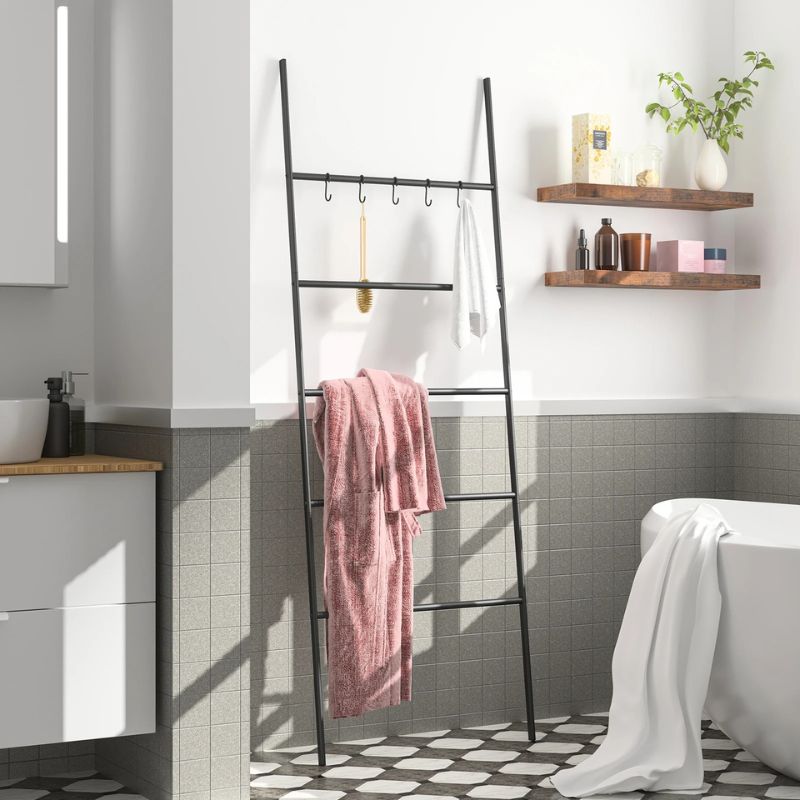 TowelRise håndklædestigen har fem kroge til ophængning af håndklæder, tøj eller tilbehør. Dens stige design kan placeres i badeværelser, soveværelser eller praktiske rum.