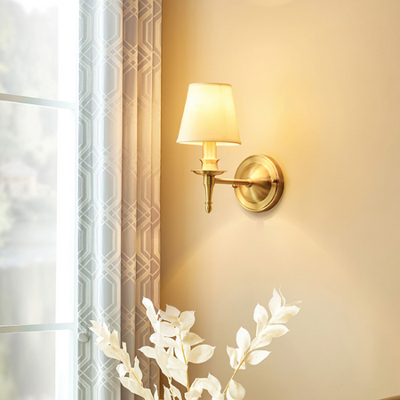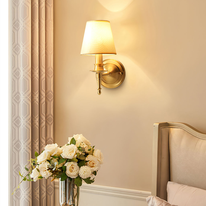 Denne væglampe har en metalramme med messingfinish kombineret med en linnedskærm. Skærmen giver diffust lys, og lampen betjenes med en standard vægkontakt. Den er beregnet til indendørs brug og kompatibel med LED- eller Edison-pærer.