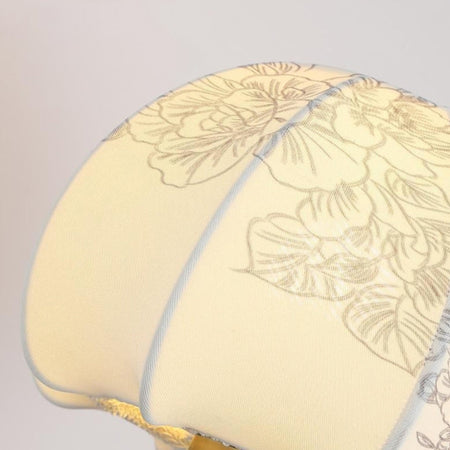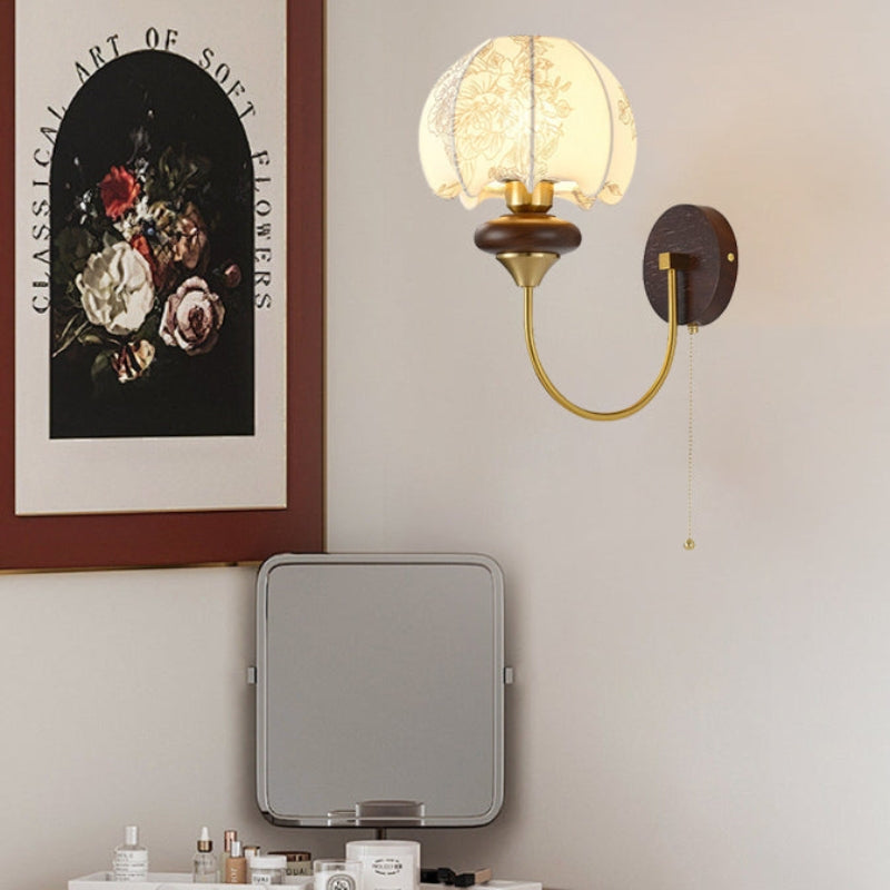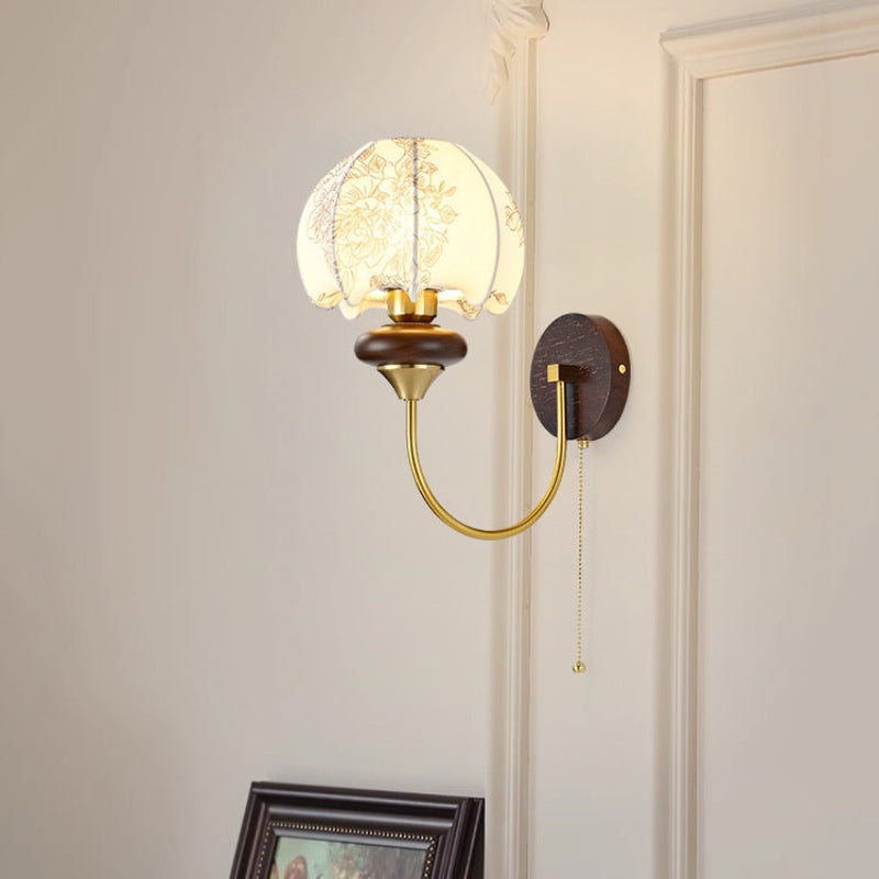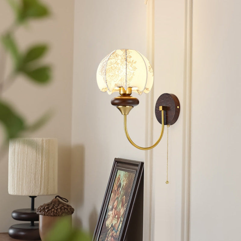 Væglampe med buet arm og dekorativ blomsterskærm. Frostet glas eller stofskærm giver blødt, diffust lys. Lampen har en mørk træbase og en poleret guldfarvet arm. Væglampe med trækæde, velegnet til soveværelser, gange eller stuer.