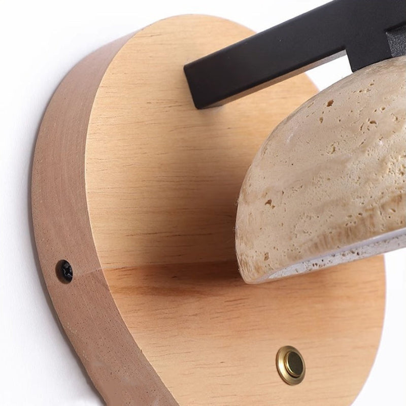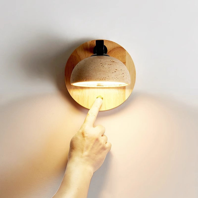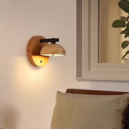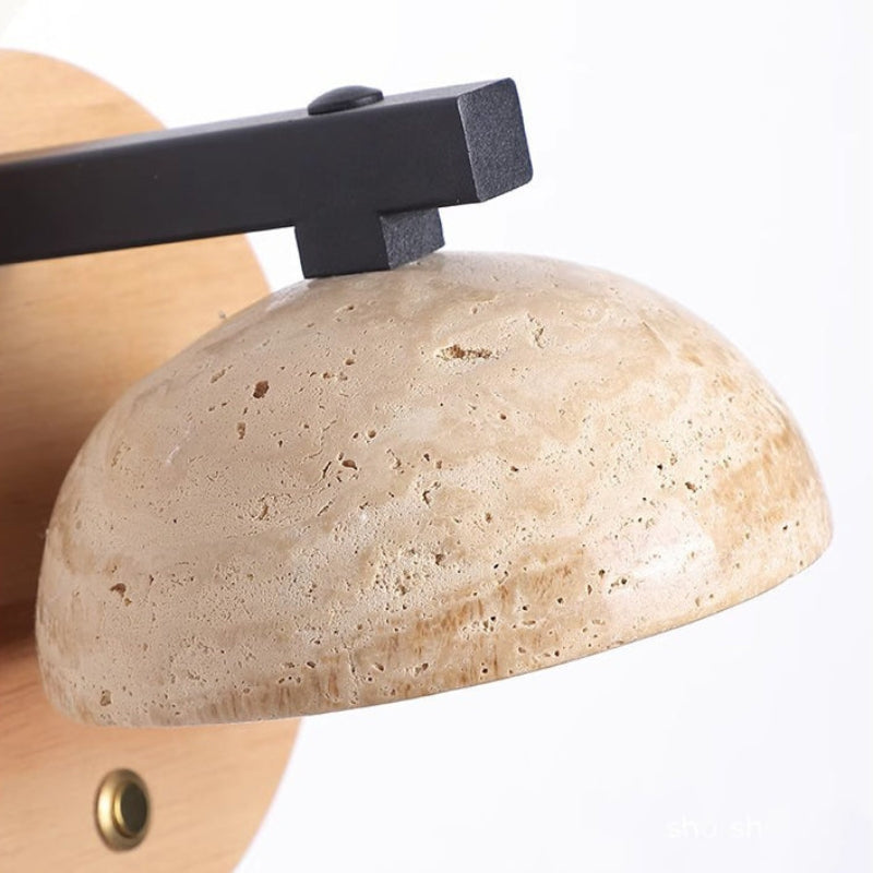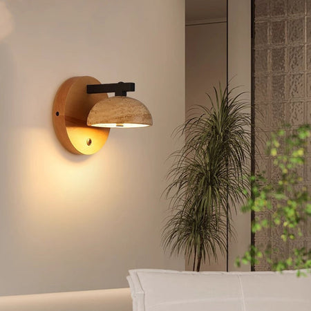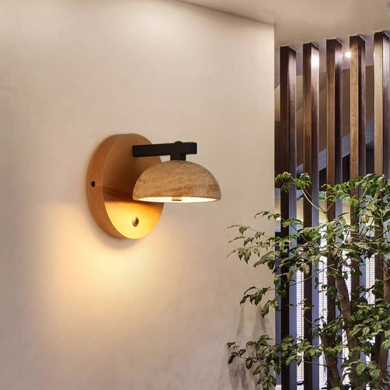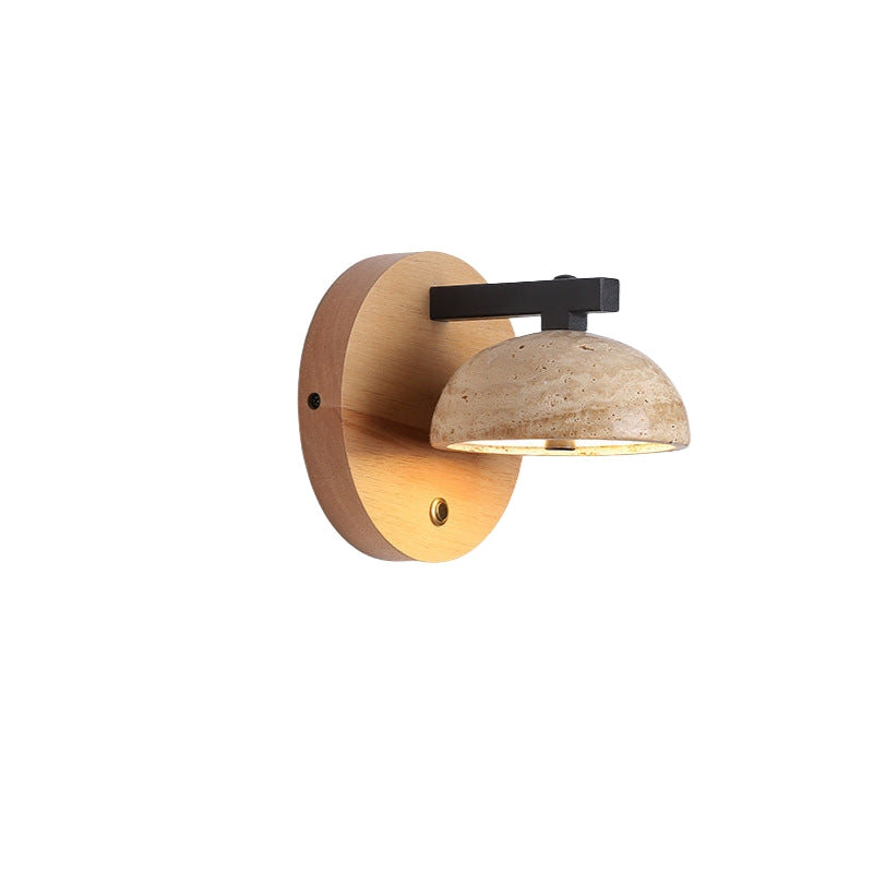 Væglampe med rund træbagplade og kuppelformet tekstureret skærm. Lampen retter lyset til læsning eller som stemningsbelysning. Den har naturlige trætoner med en kontrasterende sort beslag. Velegnet til soveværelser, gange eller som accentbelysning i stuer.
